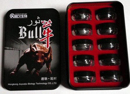 The products are marketed as dietary supplements for male sexual enhancement and are packaged as follows: Bull – 30 pills per tin, Chao Jimengnan – 4 pills per box.