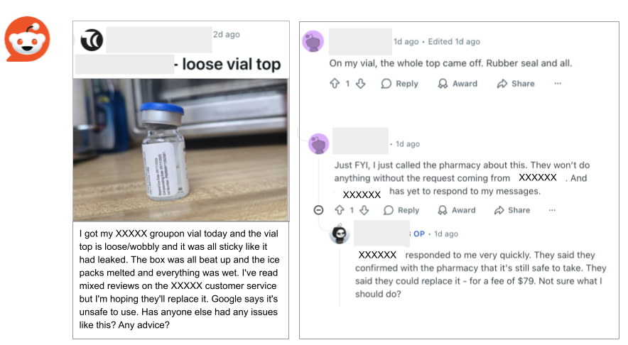 Buyer Beware: Two Reddit users who received defective vials of tirzepatide from an online retailer’s Groupon promotion aren’t likely to get fair replacements. Their vials weren’t properly sealed, but the compounding pharmacy that made them referred them back to the company that had posted the Groupon. One user said that the online seller told them that the damaged vial was safe, but FDA guidance says that vials with damaged seals are vulnerable to contamination. Injecting yourself with their contents could directly introduce dangerous microbes into your bloodstream. In the past, that has caused illness and deaths.
