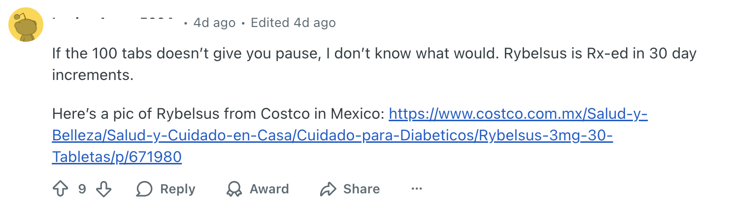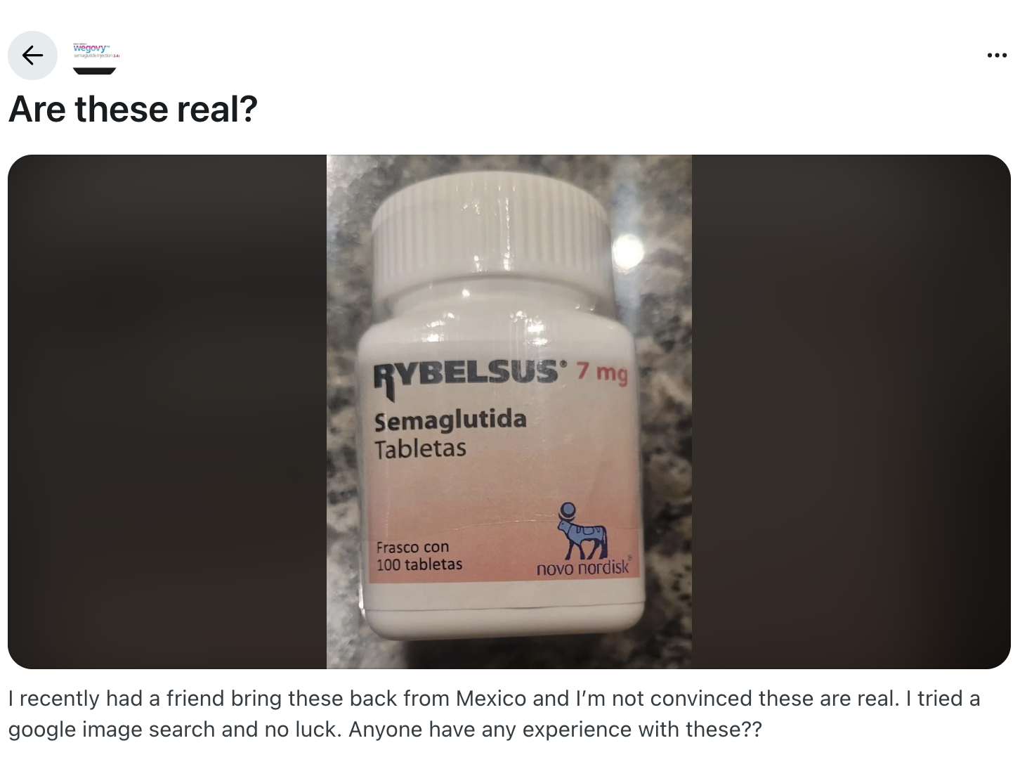 This February 2026 Reddit post features a user expressing doubt about the authenticity of Rybelsus tablets brought back from Mexico by a friend. The user noted that a Google image search failed to produce any matching packaging, and commenters quickly pointed out several red flags, most notably the bottle's "100 tabletas" count, a quantity that contradicts the standard 30-day supply for this prescription medication.