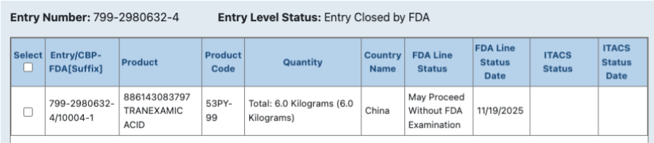 The shipment in question was imported under a product code that is listed as a general “cosmetic raw ingredient,” but the ingredient listed in ITACS, 6 kilograms of tranexamic acid, is the initial red flag. The ingredient exists in a classic “cosmeceutical” grey area, a drug that could be used as both a pharmaceutical or a cosmetic product. At that point, it comes down to the intended use of the product.