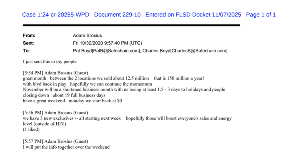 Right now, we don’t have transcripts showing how prosecutors used this evidence at trial, but the indictment tells us that this October 2020 email from Brosius to the Boyds was the trigger for a payment from Florida to elsewhere in the country. Brosius shares that he told his sales team that one of their black market suppliers, “blvd,” was “back in play.”