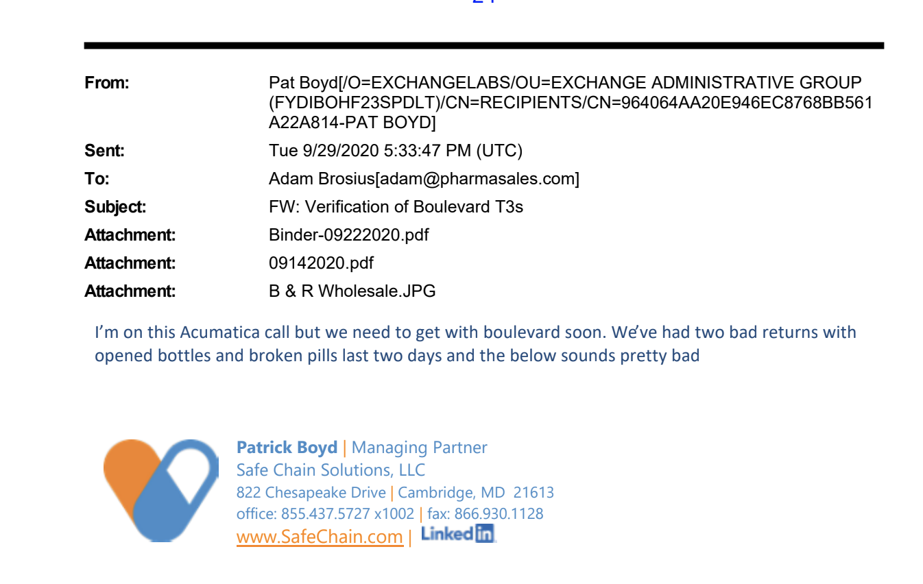 For context, the Boyds were already illegally selling medicines from Boulevard without pedigrees and coaching suppliers on how to produce documentation after the fact. In August and September they had received complaints from several pharmacies about those products (See exhibits 351 and 173). A September 2020 Microsoft Teams chat has Patrick Boyd explaining that the Boulevard products were less expensive than their other suppliers (exhibit 425). The other supplier they mention, Gentek, was also selling problematic products, such as the sealed Biktarvy bottle filled with Excedrin discussed in exhibit 149.