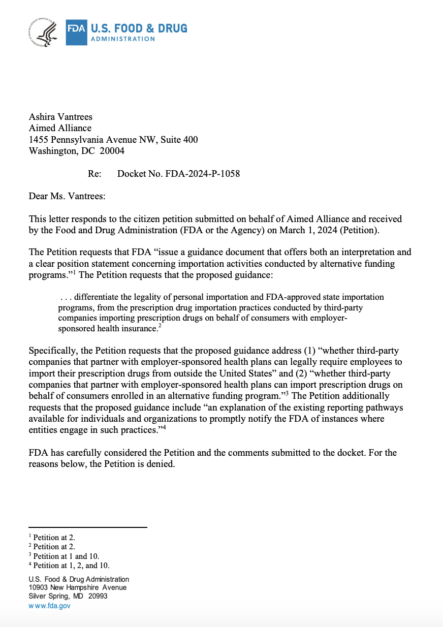 In March 2024, patient advocacy group Aimed Alliance filed a citizen petition asking the U.S. Food and Drug Administration to issue guidance clarifying whether alternative funding programs (AFPs) were legally permitted to use drug importation programs to lower insurance costs for employer-sponsored health plans. This guidance was necessary, Aimed Alliance argued, because AFPs were building international importation into self-funded health plans, essentially forcing employees to use medicines made outside FDA regulation to their own detriment, and in violation of the Food, Drug, and Cosmetic Act. AFP vendors maintain that the FDCA’s personal importation policy allows this. AIMED Alliance asked the agency to clarify this.